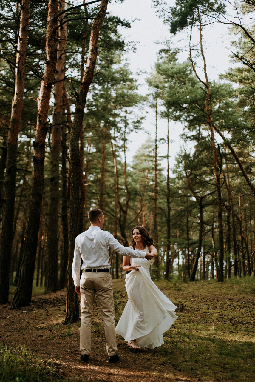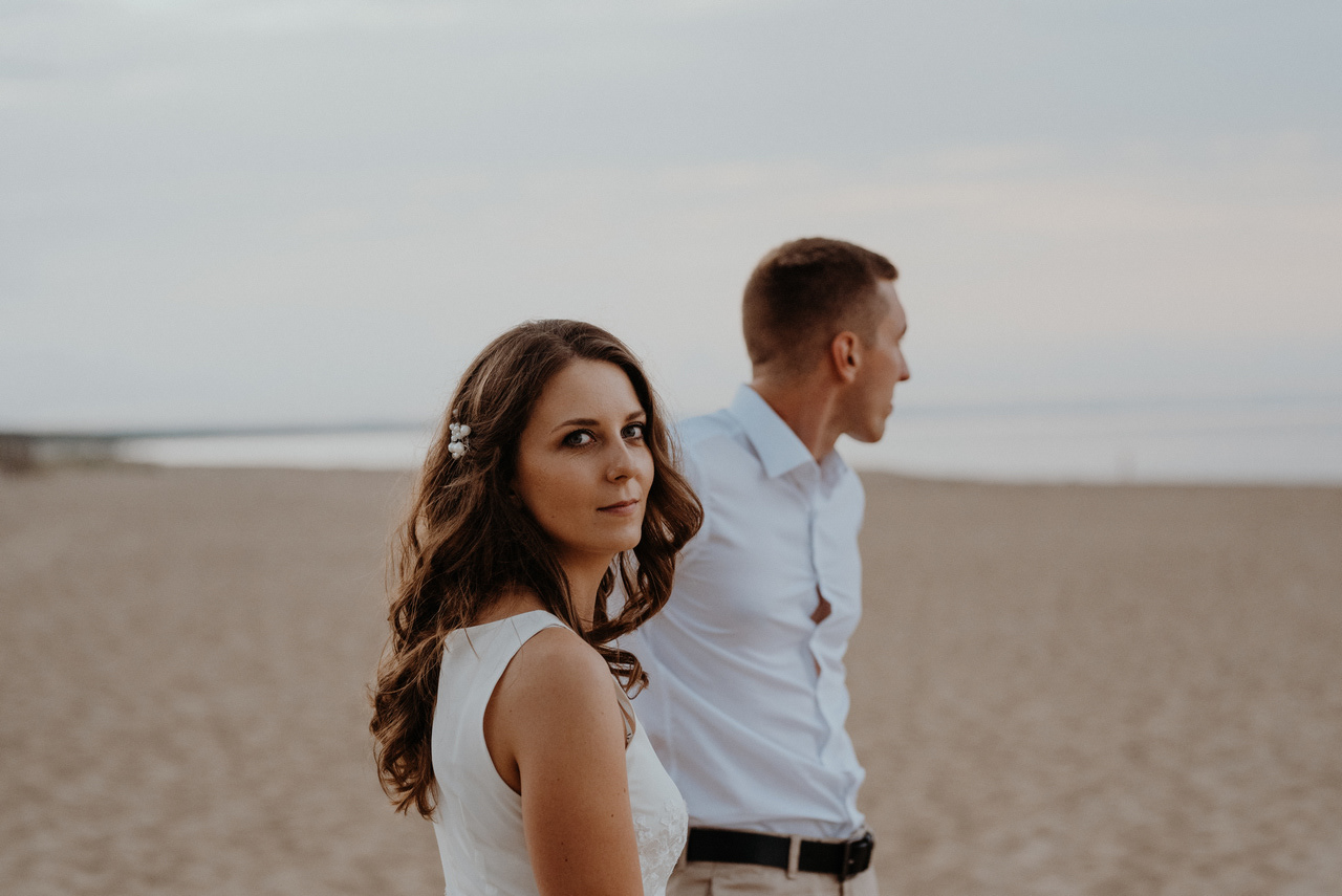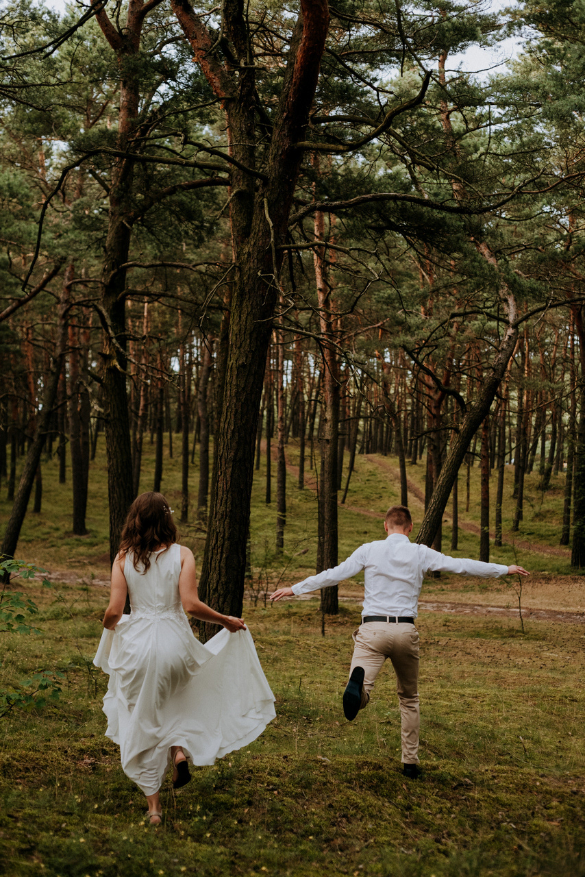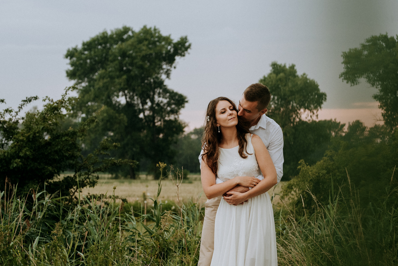 Plener poślubny na Wyspie Sobieszewskiej to super pomysł, jeśli nie możecie się zdecydować czy wolicie zrobić zdjęcia na plaży czy w lesie - mamy tu obie opcje! Takie spotkanie może być przemiłym spacerem wśród drzew, niczym w zaczarowanym lesie. W sam raz, żeby na zachód słońca dotrzeć na plażę. Nam nie dane było złote, ciepłe światło, bo trafił nam się na koniec sesji deszcz - ale zabawa i tak była przednia! Przez niespodziewaną zmianę pogody nie mogliśmy sobie zbytnio poszaleć dronem - ale hej to w końcu lipiec, który w Gdańsku nie bez powodu nazywany jest lipcopadem :) I tak czasem bywa... Po deszczu znów wyszło słońce, więc zatrzymaliśmy się spontanicznie jeszcze na chwilę .
